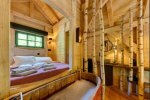 A row of birch trees elegantly integrated into the interior space separates the living room from the bedroom. Hidden between these trees, a large red wooden bath offers a unique place to relax. At the far end of the cabin, the bed overlooks the bath and is oriented so as to take full advantage of the view of the surrounding nature.