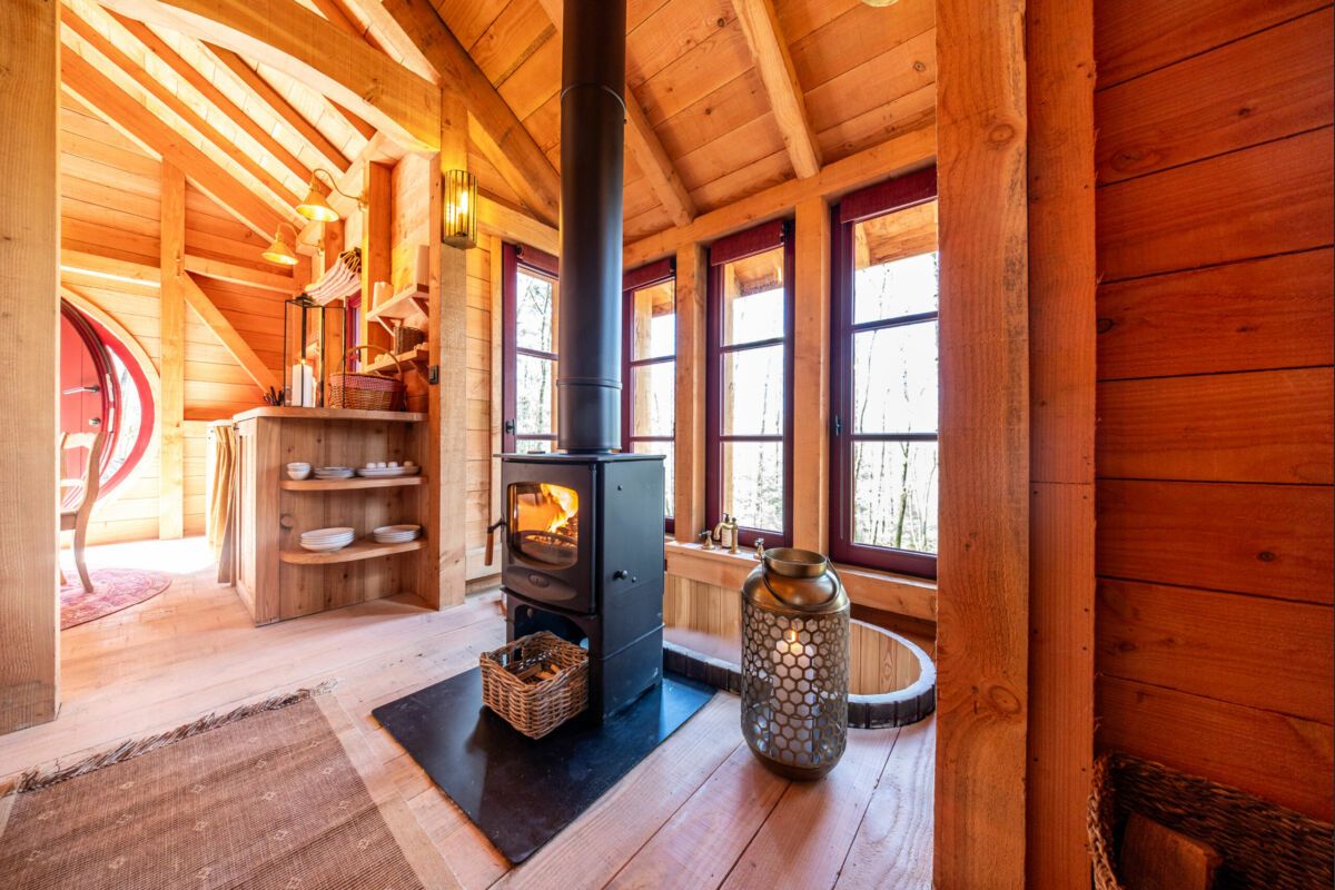 The double bed is nestled in a bow window, offering an enchanting panorama of the surrounding countryside. At its feet, a vast sofa awaits you in front of the crackling fire. Behind the stove, a wooden bathtub, discreetly embedded in the floor of the bow window, invites you to a moment of absolute relaxation, lulled by the changing light of the forest.