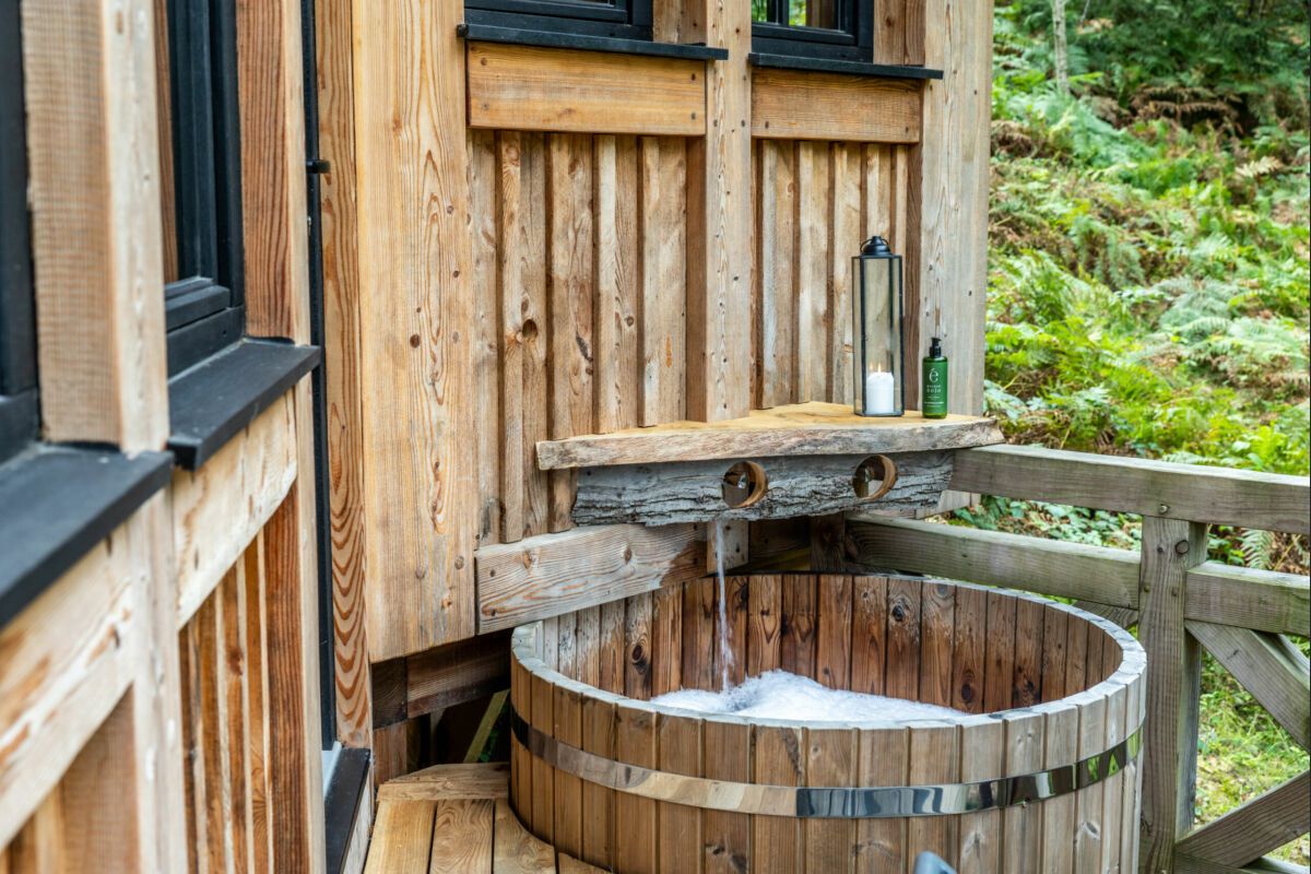 Un immense bain rond en bois se trouve dans un grand bow window entouré par la forêt. Un petit couloir secret avec une jolie vasque se glisse en-dessous du lit et offre un univers magique.