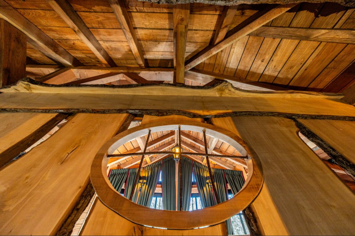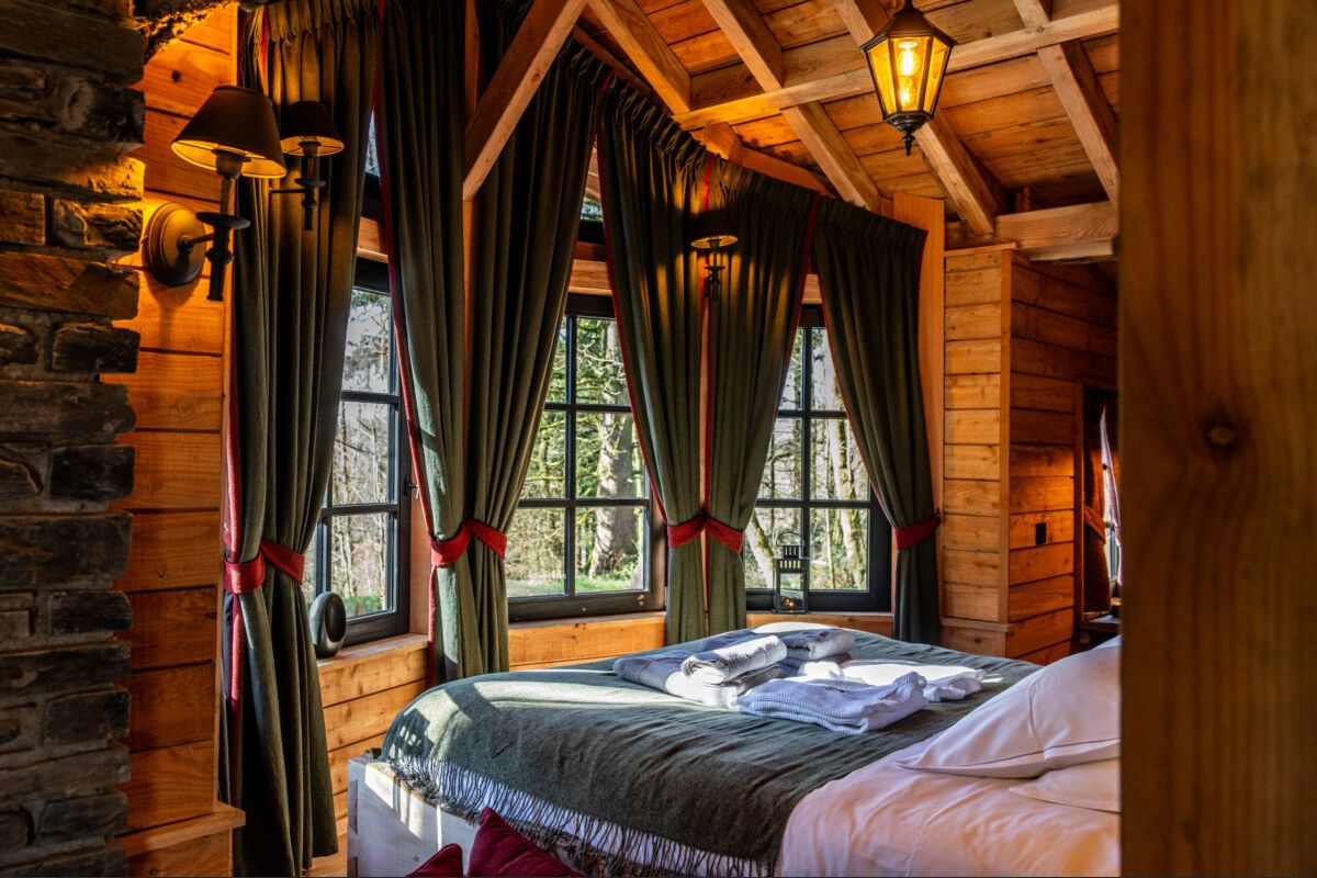 In het midden biedt een groot verhoogd bed een rustgevend uitzicht op de vijver aan de voet van de hut. Links staat een comfortabele zithoek tegenover de open haard voor gezellige momenten.