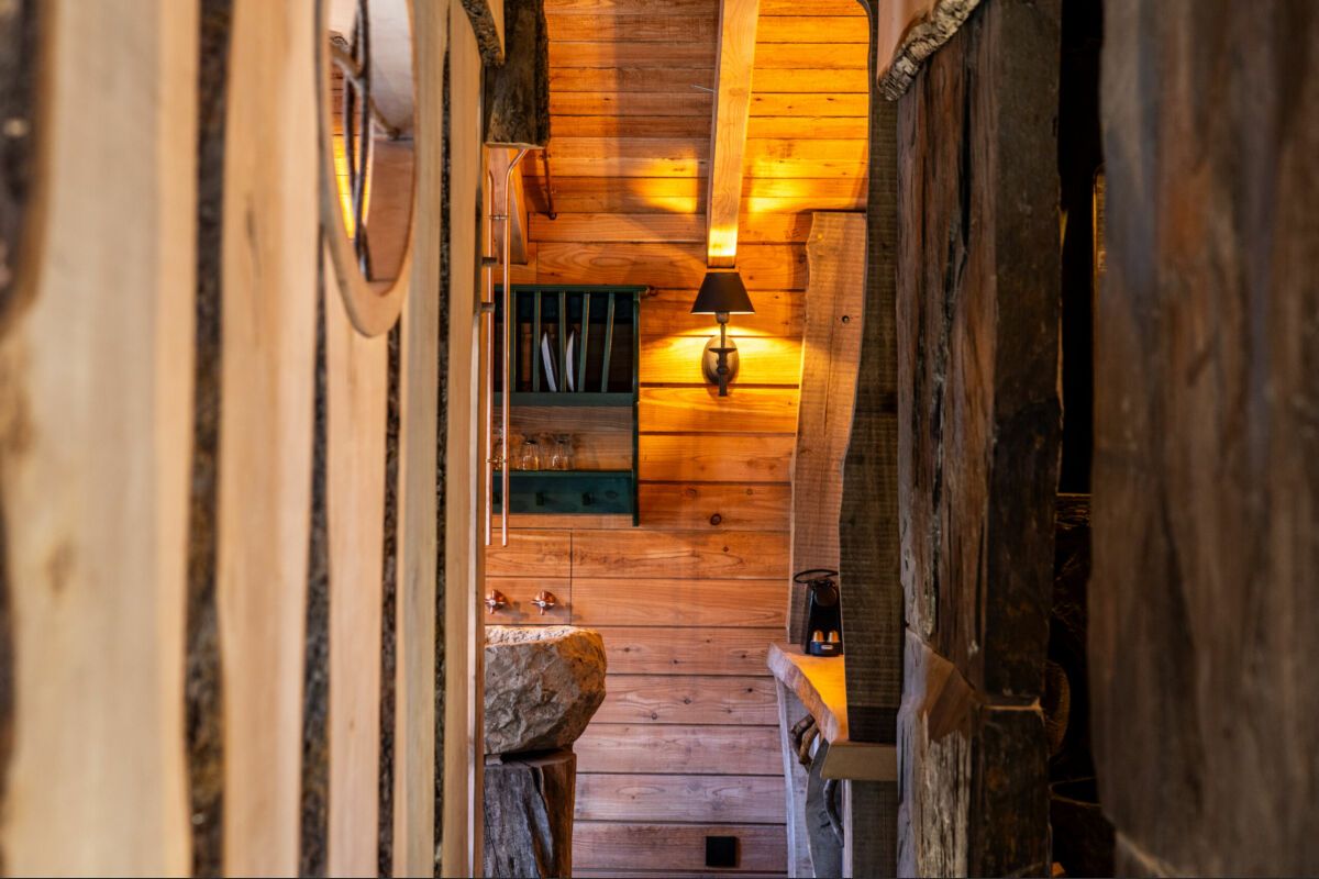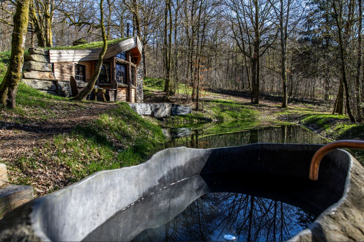 De Cabane de Frédéric ligt verscholen aan het einde van een pad en onthult een unieke en charmante wereld. Het eerste wat opvalt is het groendak, dat perfect in de natuur is geïntegreerd. De toegang is via een stenen trap, als een uitnodiging om af te dalen in een geheime grot.