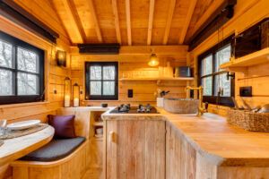 Een gigantisch houten bad, bereikbaar via een trapje, domineert de haard en de zithoek, het is genesteld in een boograam met uitzicht op het omringende bos. Een charmante en zeer lichte keuken is genesteld in een kleine ruimte die met een paar treden verbonden is met de woonkamer.