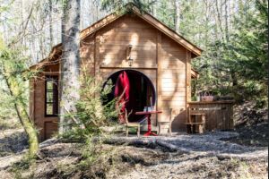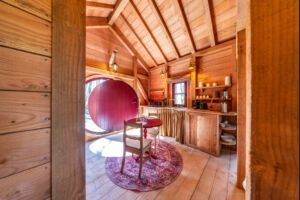 Bij aankomst word je verwelkomt door een buitenruimte je met een Scandinavisch bad. Een majestueuze ronde rode deur zwaait open en onthult de warme, intieme wereld van de hut. Aan de linkerkant past een mooie keuken in het decor, terwijl in het midden een elegante ronde rode tafel staat.